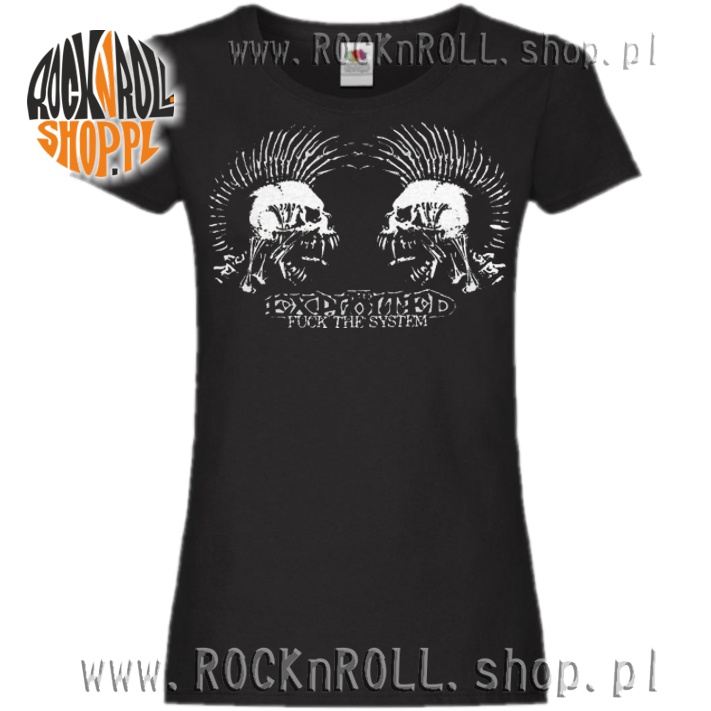 T-shirt dla Pań, posiada nadruk przedstawiający dwóch szkieleto-punków szczerzących się wściekle do siebie, jako logo szkockiego zespołu hardcore-punkowego Exploited.