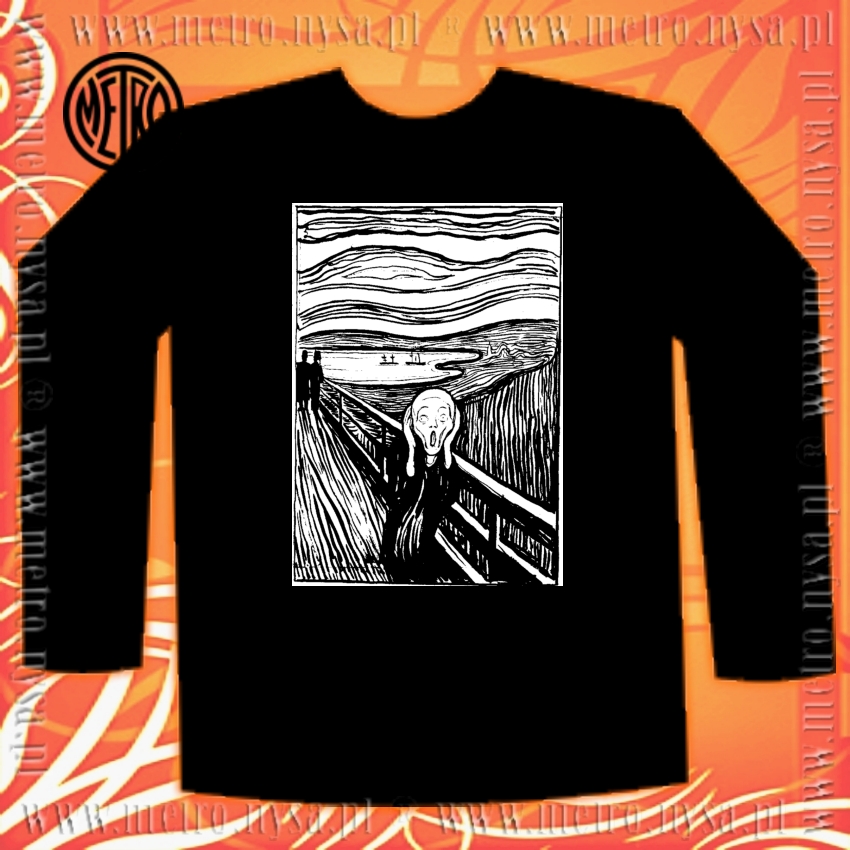 Ciekawa czarno-biała wersja słynnego obrazu pt. "Krzyk" Edwarda Munch'a na bluzce z długim rękawem.