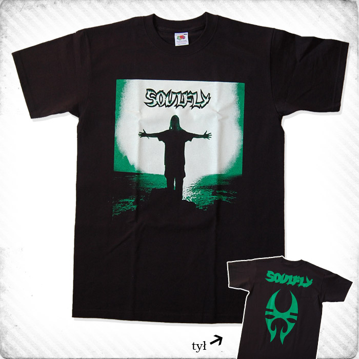 Czarny t-shirt z nadrukiem loga oraz okładki zespołu Soulfly.