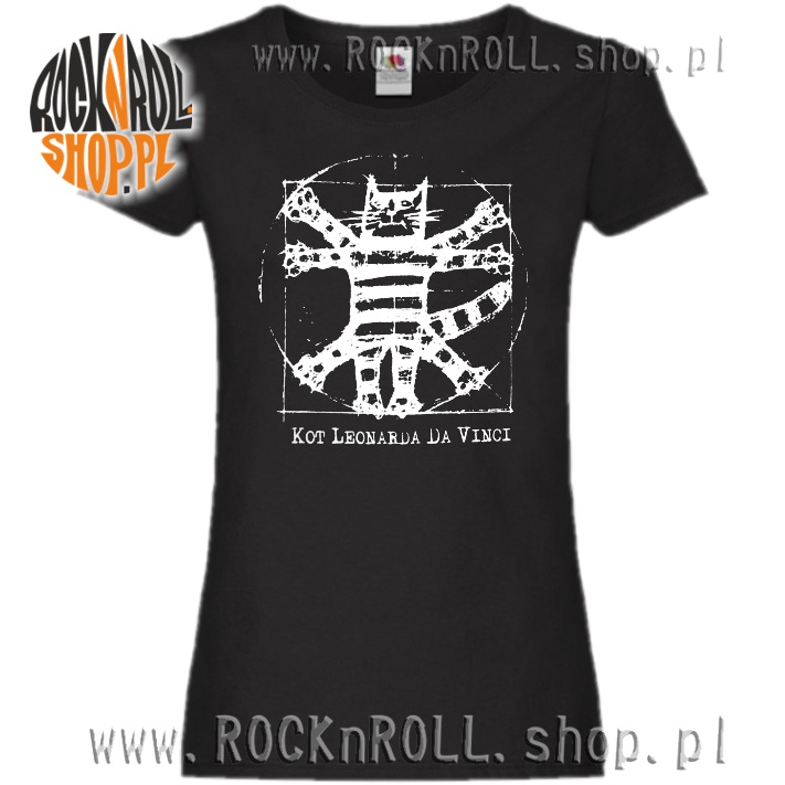 Wygodna czarna koszulka damska z krótkim rękawkiem oraz nadrukiem parodiującym rysunek schematu anatomicznego ludzkiego (kociego) ciała Leonarda da Vinci.