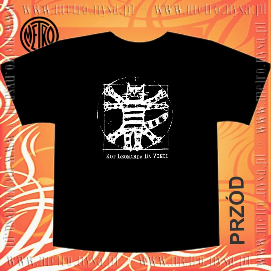 Czarna koszulka z krótkim rękawkiem oraz nadrukiem parodiującym rysunek schematu anatomicznego ludzkiego ciała Leonarda da Vinci.