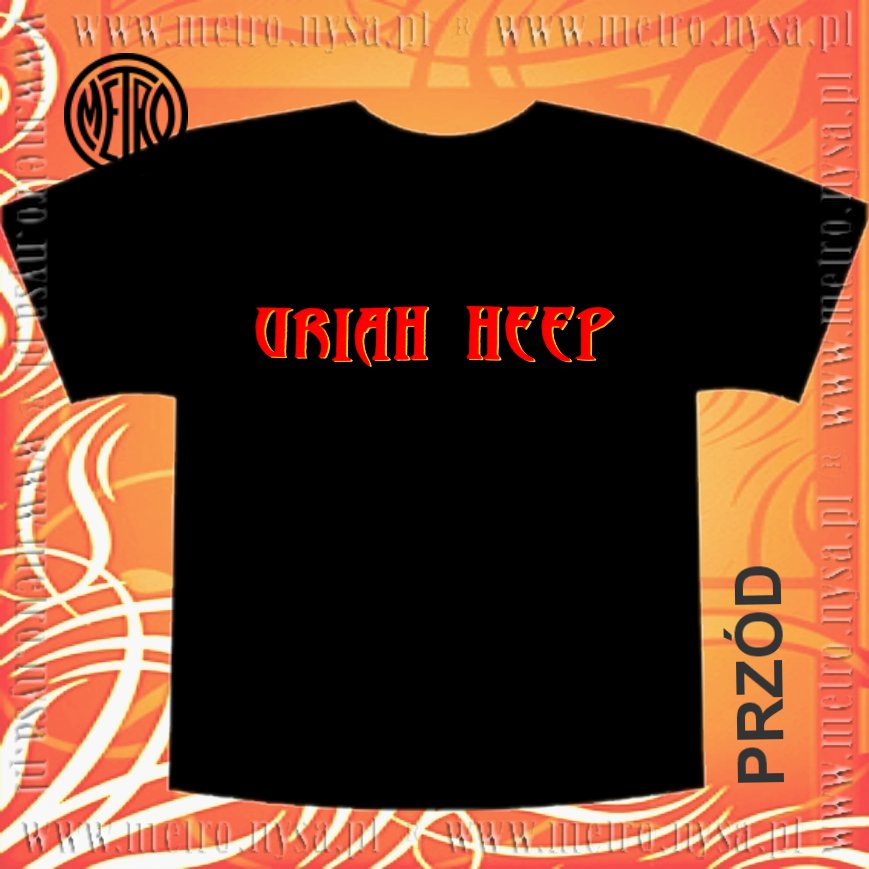 Czarna koszulka z czerwono żółtym logiem rockowej grupy o nazwie Uriah Heep.