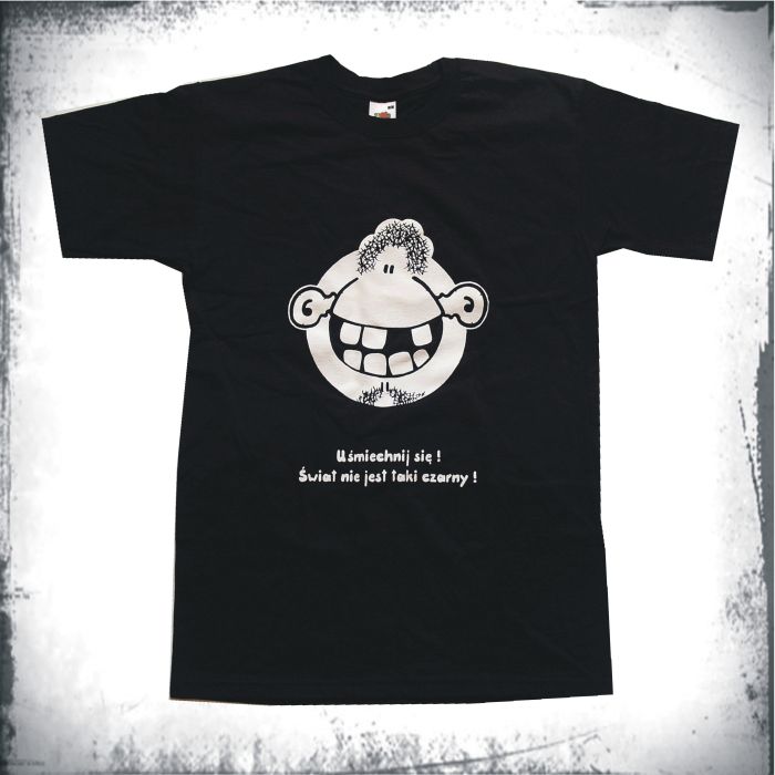 Logo uśmiechającej się owieczki oraz hasło "Uśmiechnij się, Świat nie jest taki czarny" na koszulce.