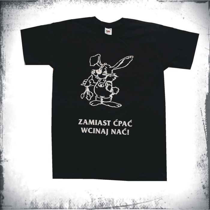 Logo uśmiechniętego królika jedzącego marchewkę i hasło "Zamiast ćpać - Wcinaj Nać" na koszulce.