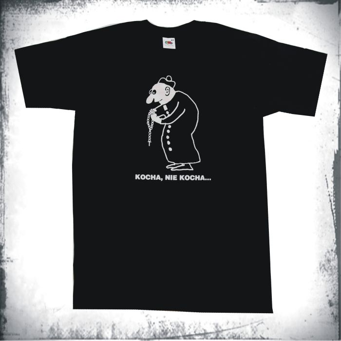 T-shirt z krótkim rękawkiem z karykaturą księdza wróżącego z różańca.