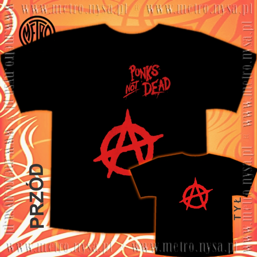 Czarna koszulka z czerwonym nadrukiem z symbolem punkowej ANARCHII oraz napisem PUNK'S NOT DEAD.