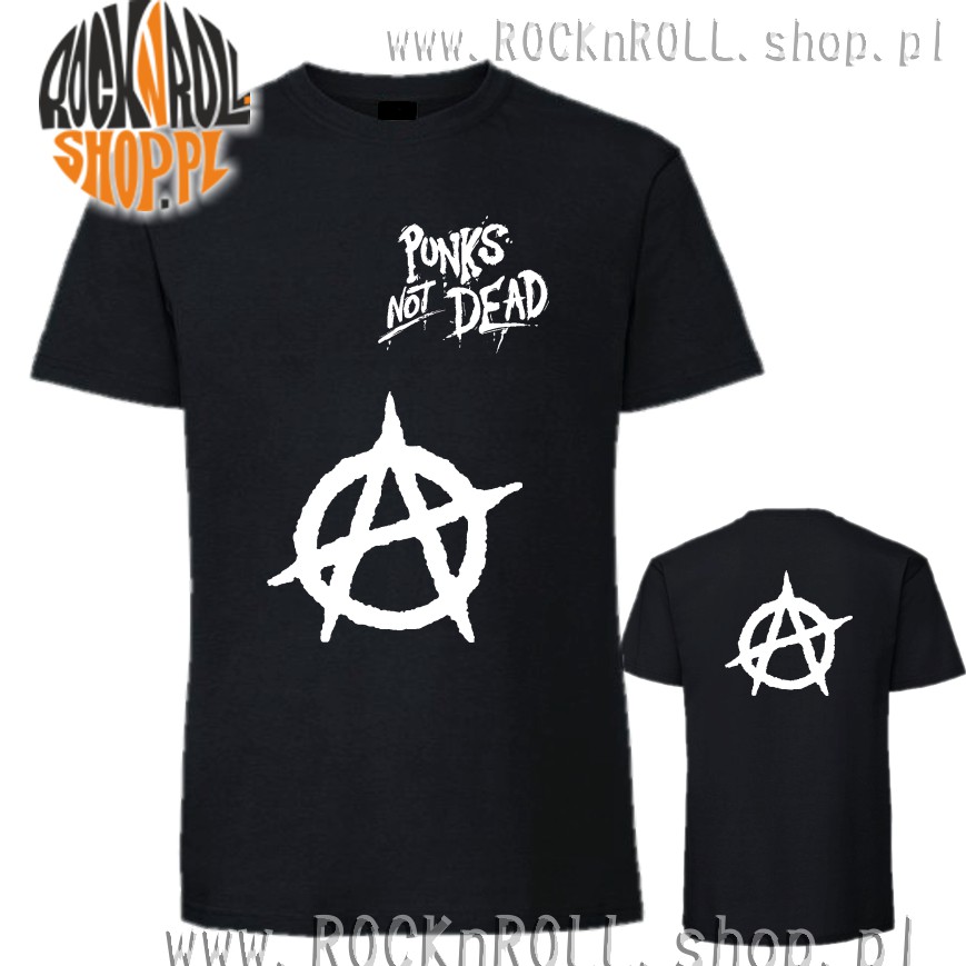 Czarna koszulka z białym nadrukiem z symbolem punkowej ANARCHII oraz napisem PUNK'S NOT DEAD.