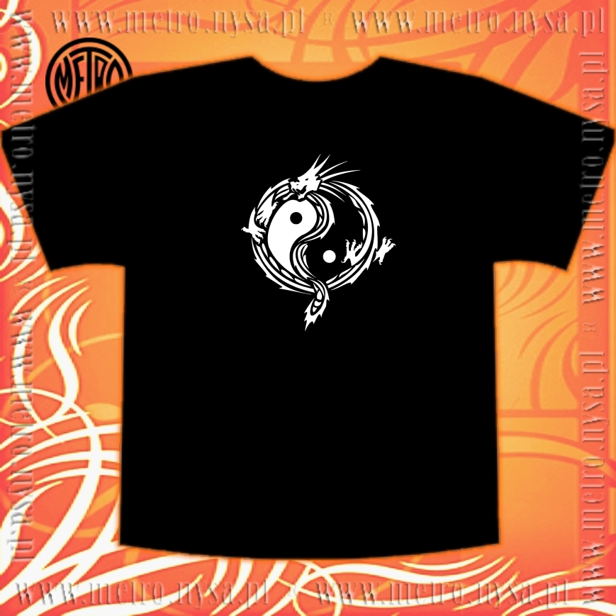 Czarna koszulka z grafiką smoka otaczającego antyczny chiński znak ładu i chaosu Yin Yang.