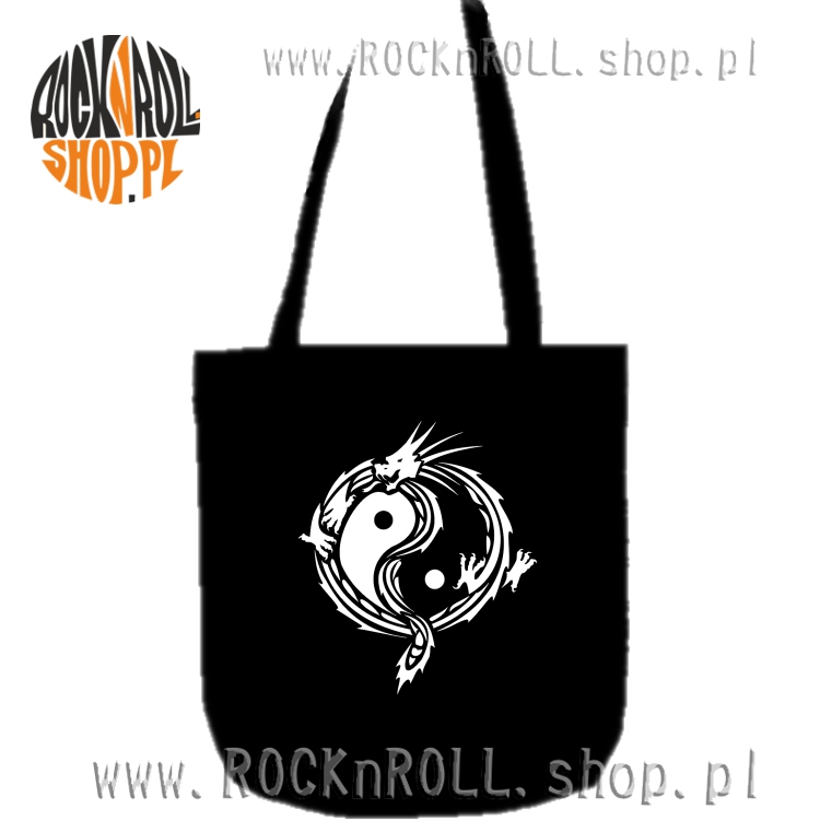 Czarna wygodna i praktyczna torba ekologiczna z grafiką smoka otaczającego antyczny chiński znak ładu i chaosu Yin Yang.