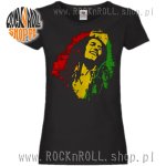 Wygodna czarna koszulka damska z wizerunkiem króla reggae - Bob'a Marley'a - w kolorach rasta.