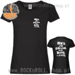 Koszulka ze znanym dobrze hasłem SEX DRUGS AND ROCK'N'ROLL! W wersji wygodnego t-shirtu dla Pań. Mały nadruk z przodu, duża grafika na plecach