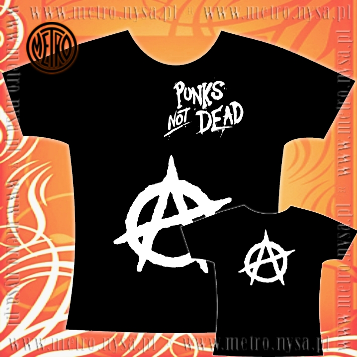 Czarna koszulka z białym nadrukiem z symbolem ANARCHII oraz napisem PUNK'S NOT DEAD.