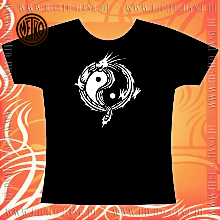 Czarna damska koszulka z grafiką smoka otaczającego antyczny chiński znak ładu i chaosu Yin Yang.