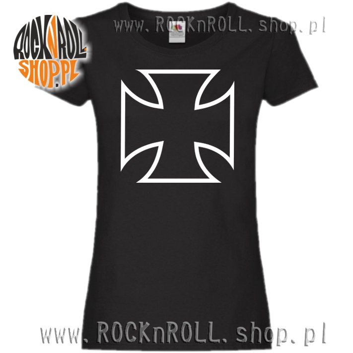 Czarna koszulka damska z grafiką motocyklowego żelaznego krzyża.
